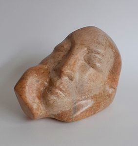 2023Half bewerkt stuk braziliaans speksteen waaruit een gezicht naar voren komt.